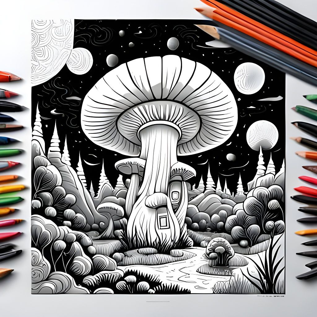 A detailed coloring page showcases a giant magic mushroom. The black and white linework art style is reminiscent of a hyperdetailed, futuristic sci-fi movie scene.