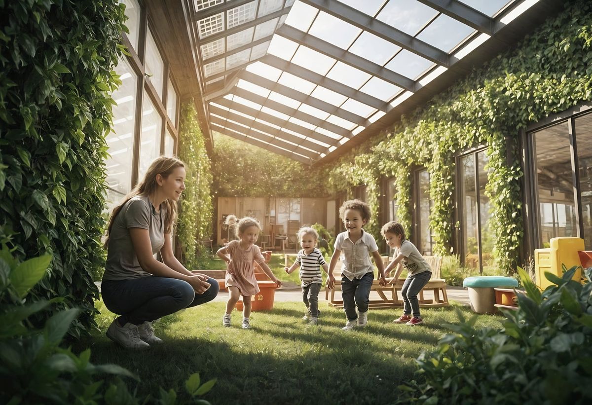 A vibrant image of a sunlit solarpunk daycare center where children play amidst lush greenery and technology, symbolizing a bright, sustainable future.