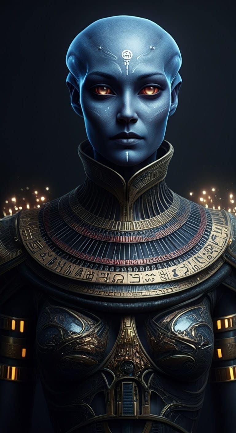 A mesmerizing, hyper-photorealistic portrait of a young Anunnaki goddess, radiating otherworldly elegance in a dark studio setting. Her metallic skin shimmers with subtle gradients, and her regal features are adorned with intricate, glowing markings. Shot on 35mm film with cinematic lighting, this image ...