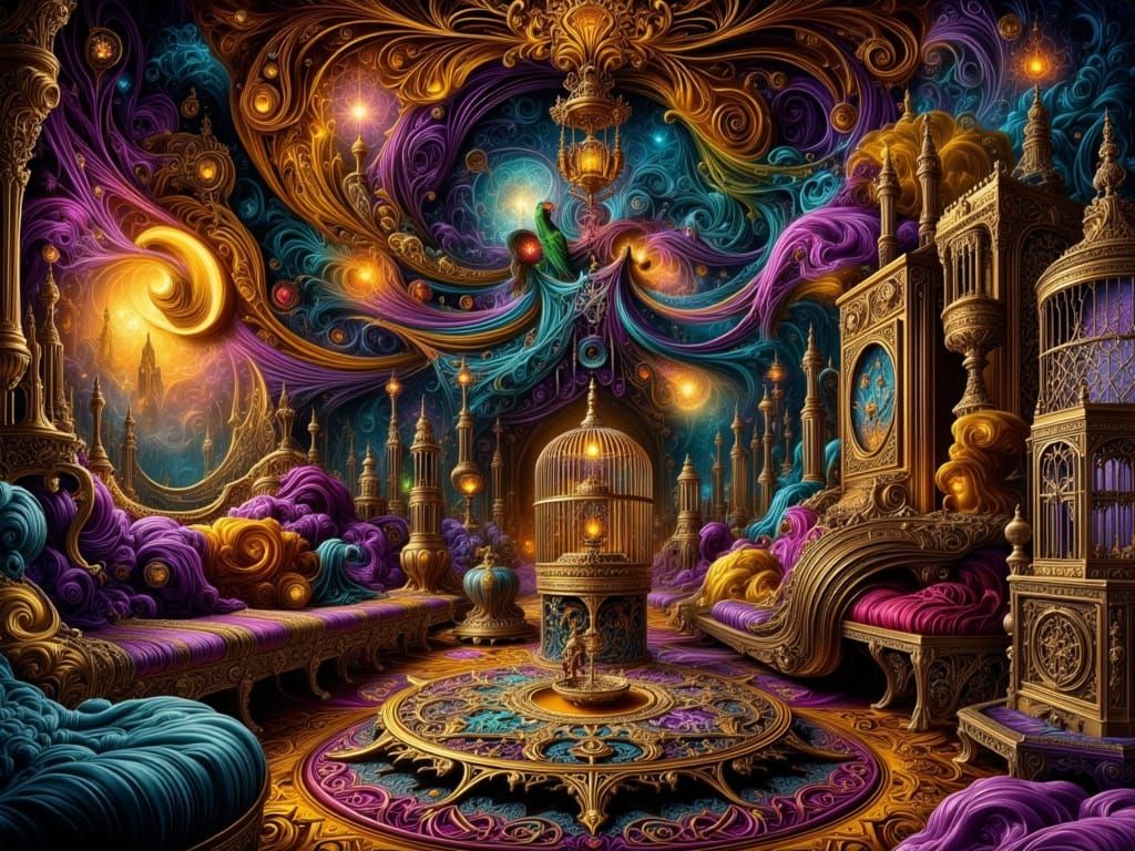 This hyperrealistic image showcases a vibrant zentangle parlor room with intricate patterns and vivid colors. Featuring elegant furniture, 3D artwork, and a central parrot in a cage, illuminated by cinematic golden hour light.