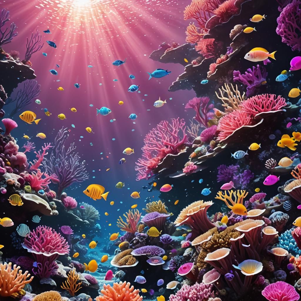A stunning underwater scene featuring a vibrant coral reef teeming with exotic fish. The digital artwork features intricate textures, sparkling glitter accents, and soft, glowing light in deep, contrasting colors.