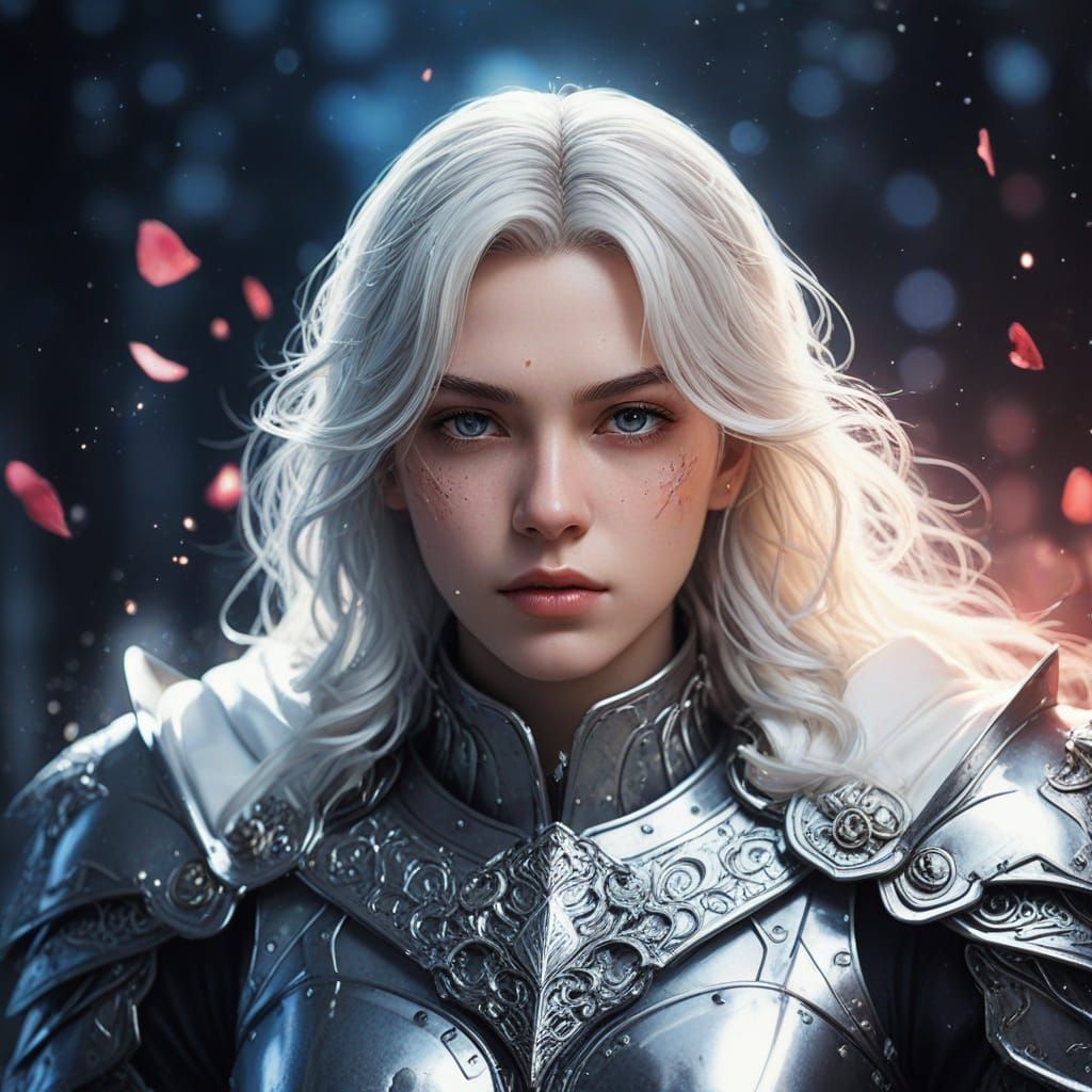 This image is a vibrant anime illustration of a heroic light knight set against a bright blue sky with rose petals and subtle bokeh, showcasing detailed and high-contrast fantasy art with pastel and saturated colors.