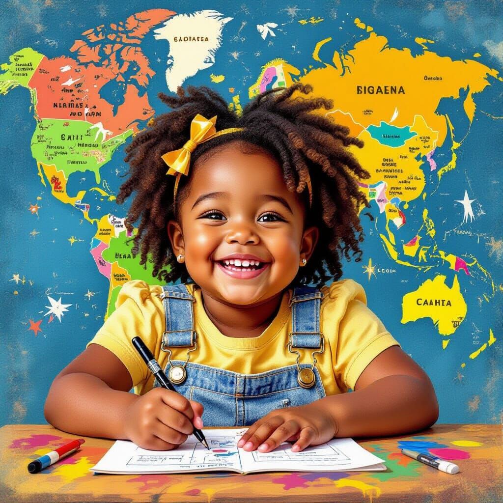 A beaming, round-faced Black girl enjoys learning about U.S. states and capitals. The image features a vibrant, colorful graffiti art style with high contrast and intricate detail.