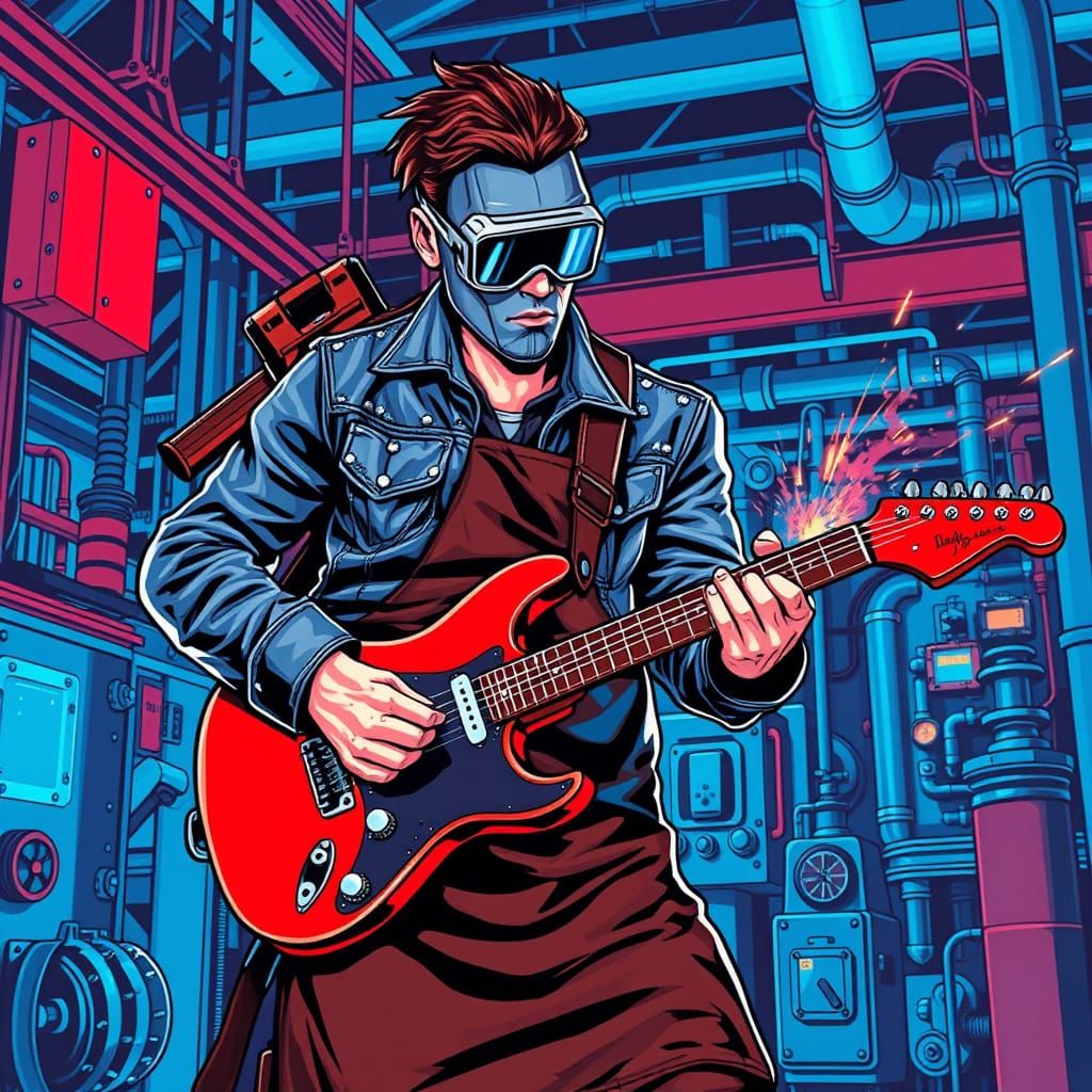 This vibrant vector illustration captures a welder's dynamic performance amidst a bustling metalworking plant, with bold lines, bright colors, and intricate details, evoking the styles of Syd Mead and Ash Thorp.