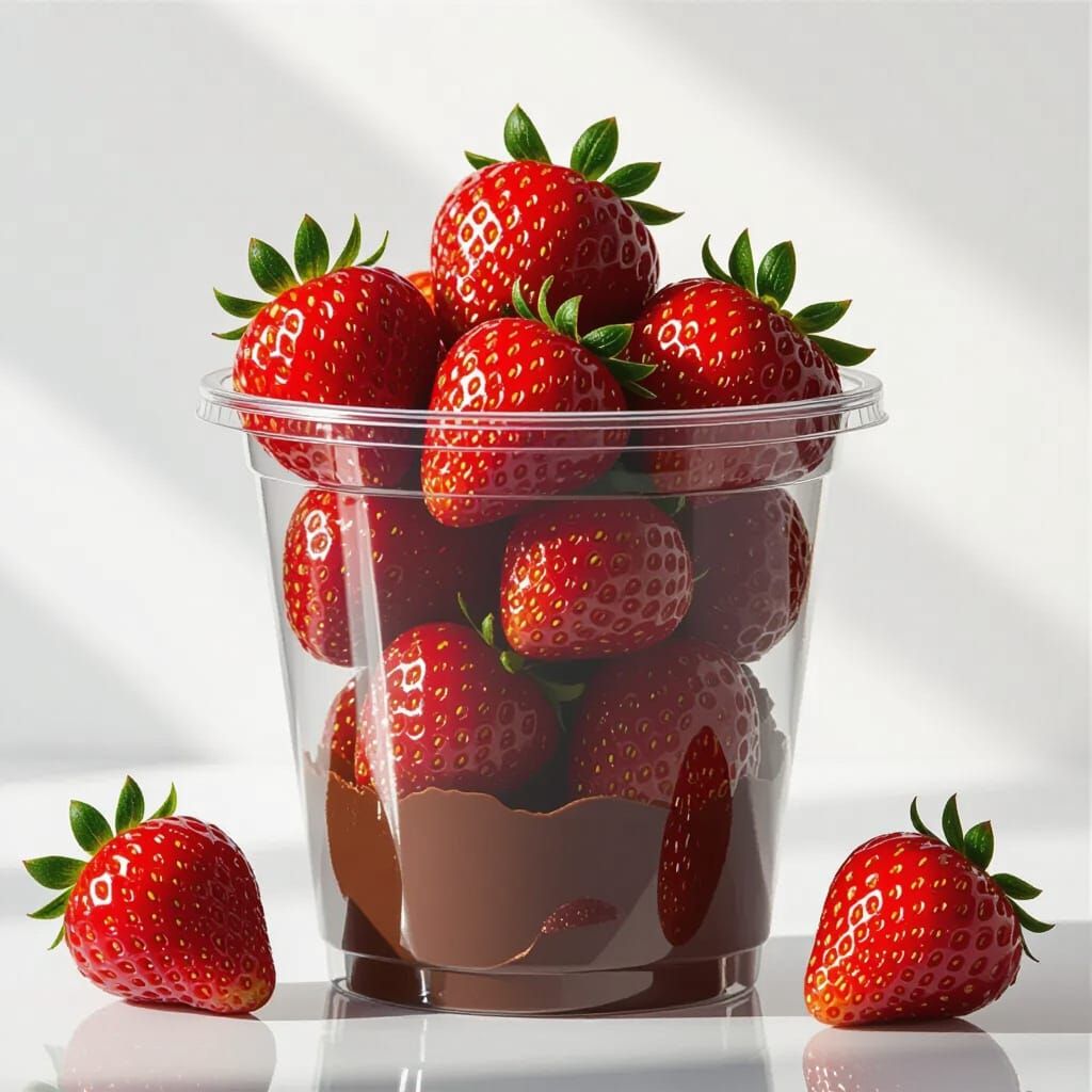 A striking picture of strawberries coated in chocolate inside a clear plastic cup. The image features bold lighting, glossy textures, and vibrant colors, as 3D rendered digital art.