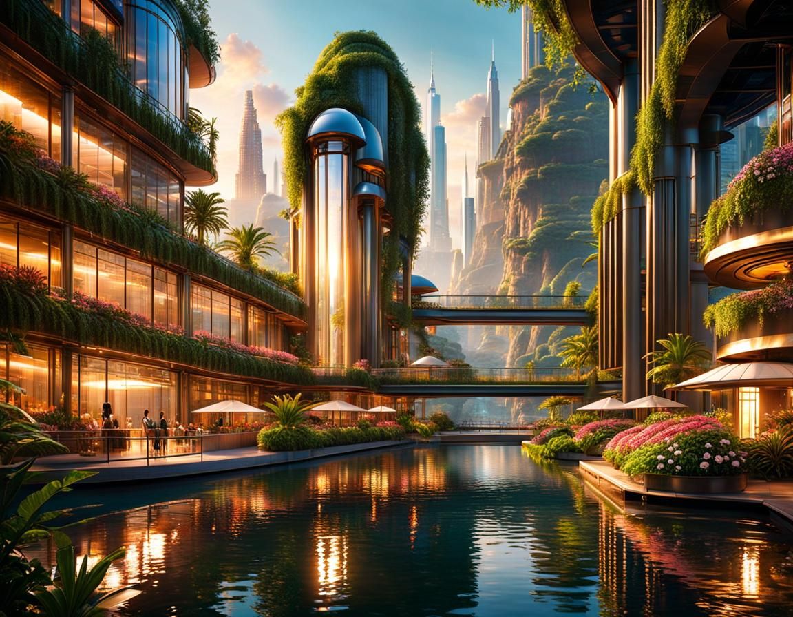 This image shows a utopian city with futuristic architecture nestled among lush vegetation and waterfalls, bathed in golden hour light. The scene is rendered with intricate details and cinematic composition.