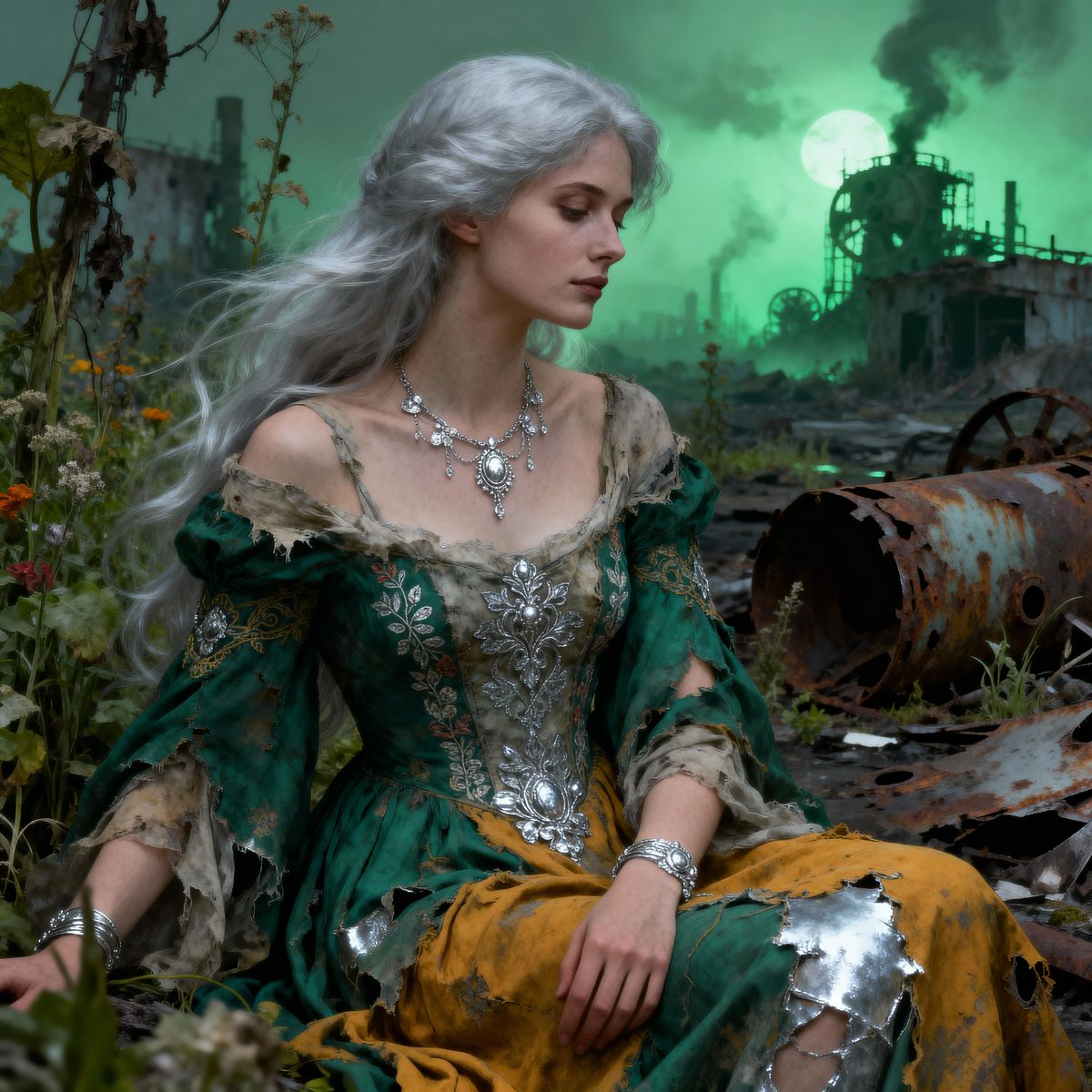 A serene woman with silver hair in a mended gown sits in a post-apocalyptic garden. Delicate silver jewelry adorns her. The scene features a soft, sickly green light and a bokeh effect, with detailed, gritty textures and deep colors.