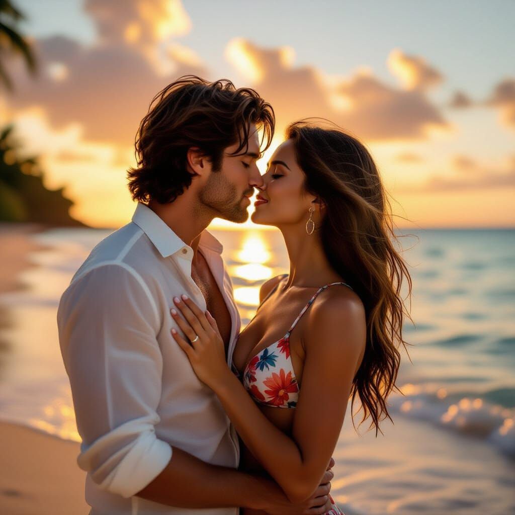 This image depicts a romantic moment of a couple kissing passionately on a tropical beach during sunset, captured with warm golden hour lighting and soft focus.