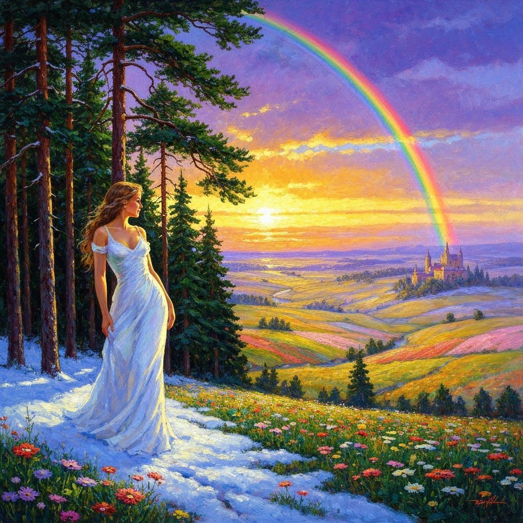 This image depicts a woman in a white dress within a bright winter scene. It features lush green trees, a golden sunset with purple hues, a rainbow, a distant castle, and vibrant flowers, rendered with rich colors and dynamic brushstrokes.