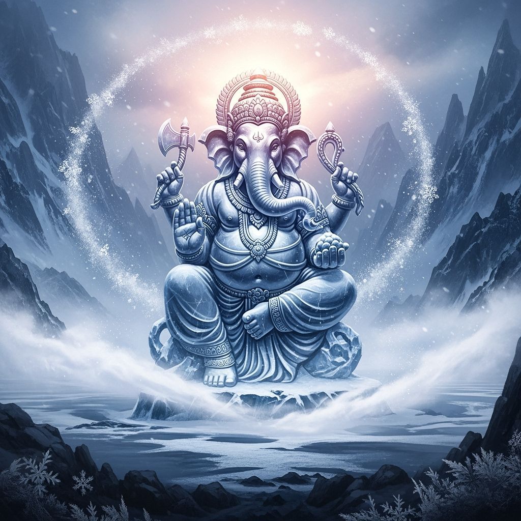 This image shows a breathtaking ice sculpture of Lord Ganesha emitting a serene divine light. The sculpture is surrounded by a swirling flurry of snowflakes in a dramatic frozen landscape with towering mountains. The image has a dark fantasy concept art aesthetic.