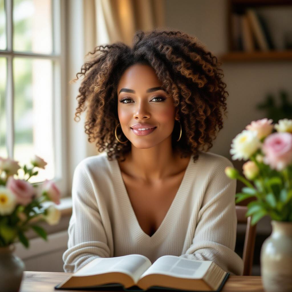 This image shows an African-American woman with warm skin and styled hair, speaking with a calm expression in natural light. The candid photo radiates peace and encouragement, featuring a Bible and flowers.