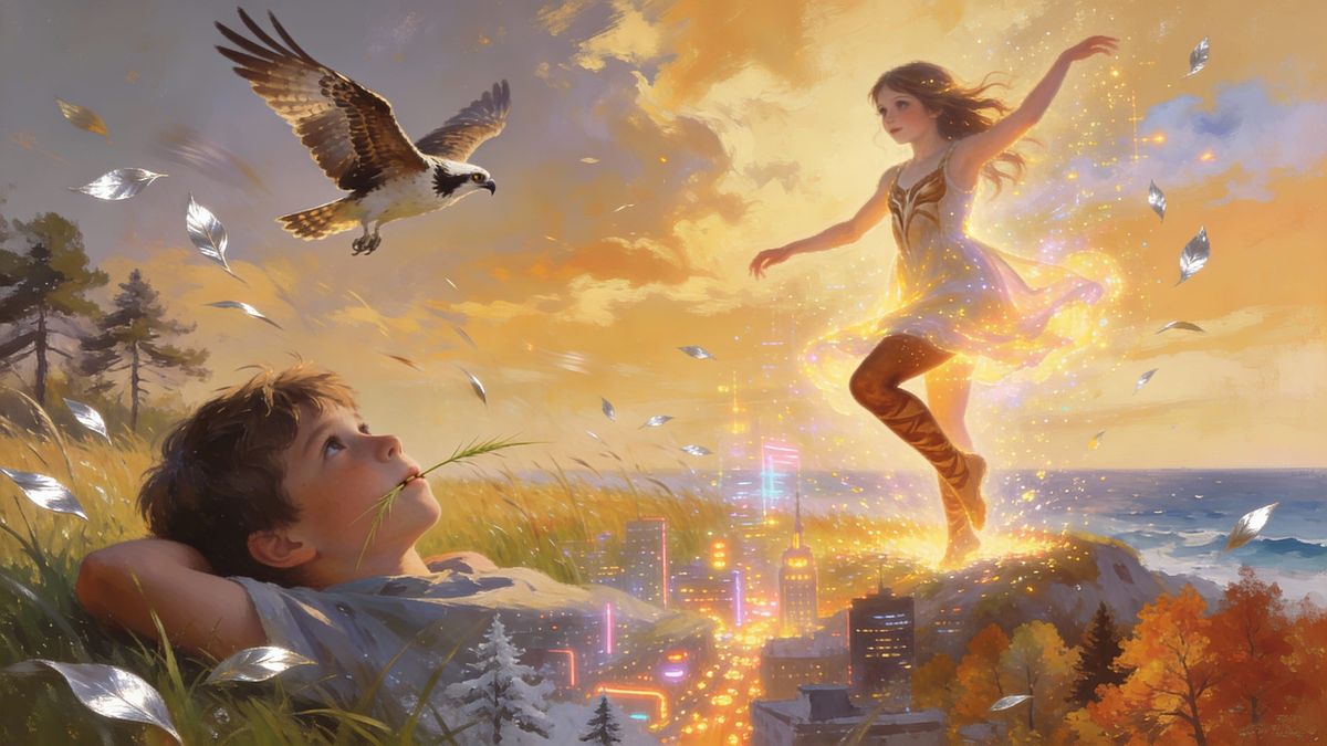 This image depicts a nostalgic scene of a boy in a windy field, dreaming of distant places. A girl dances nearby, surrounded by shimmering visions of nature and cityscapes, in a painterly, surreal album-art style.