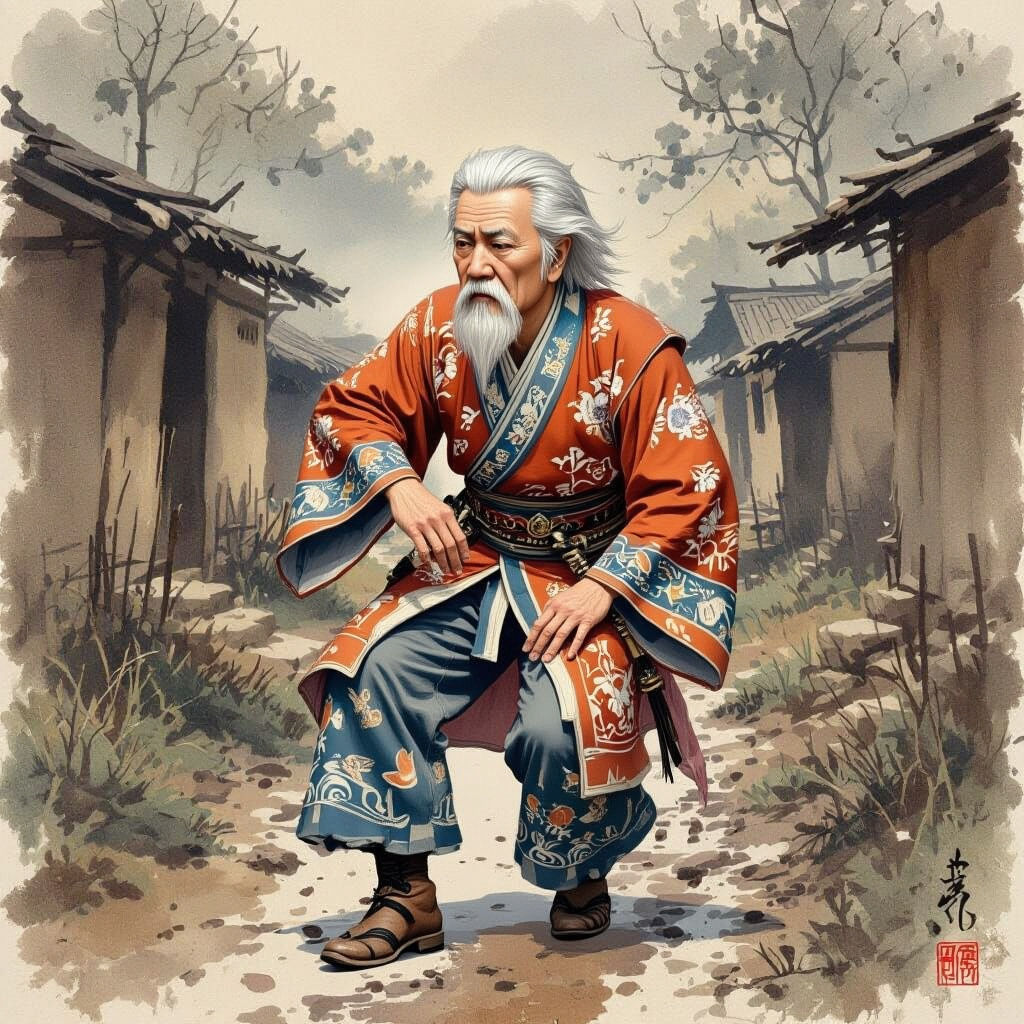 This image shows a Chinese man in traditional clothing, tipsy with a dark bottle of wine in hand. He walks along a muddy path near shanty huts.