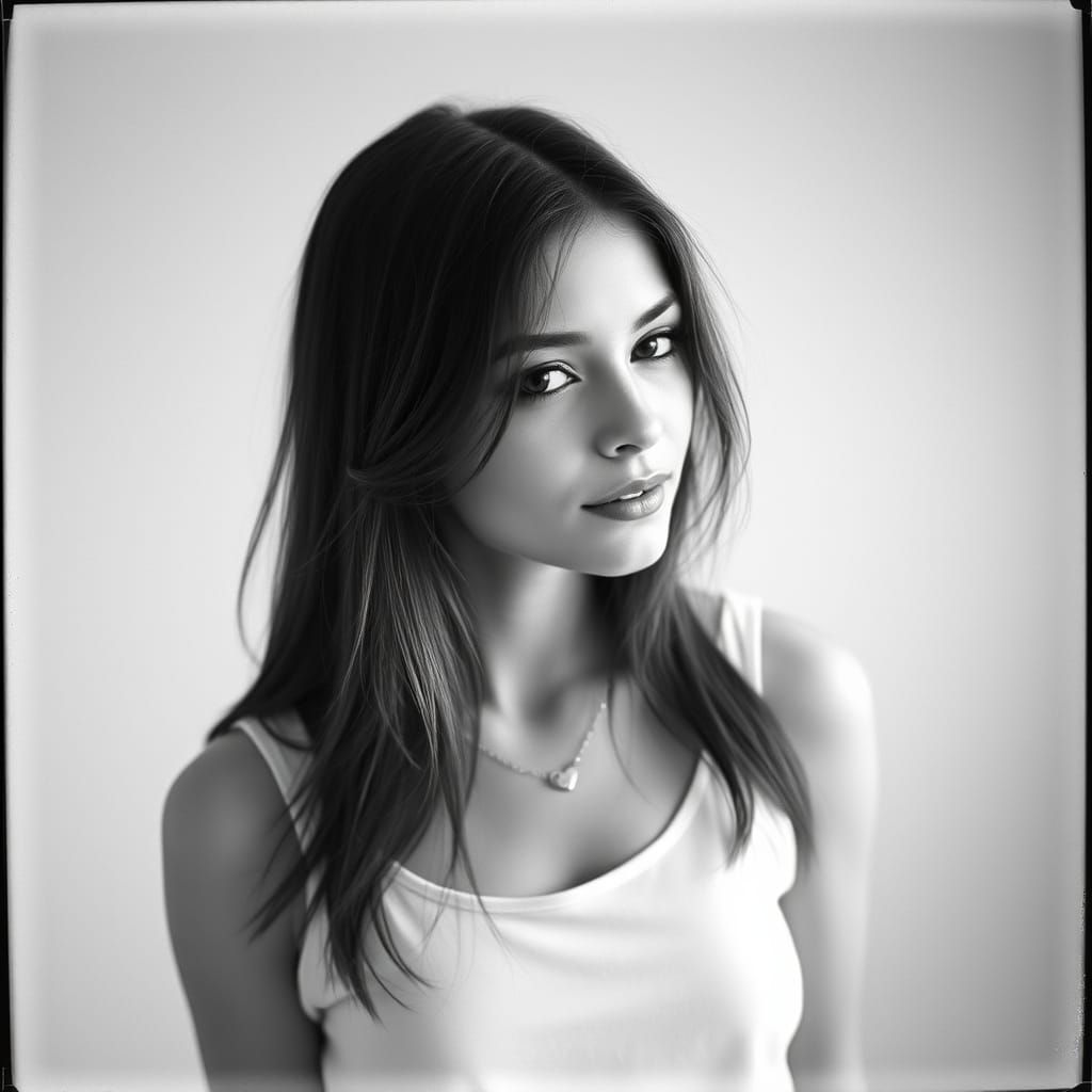 A grainy black and white portrait of a young woman with long hair and a heart necklace. The candid shot evokes Y2K photography with soft focus and blurred background.