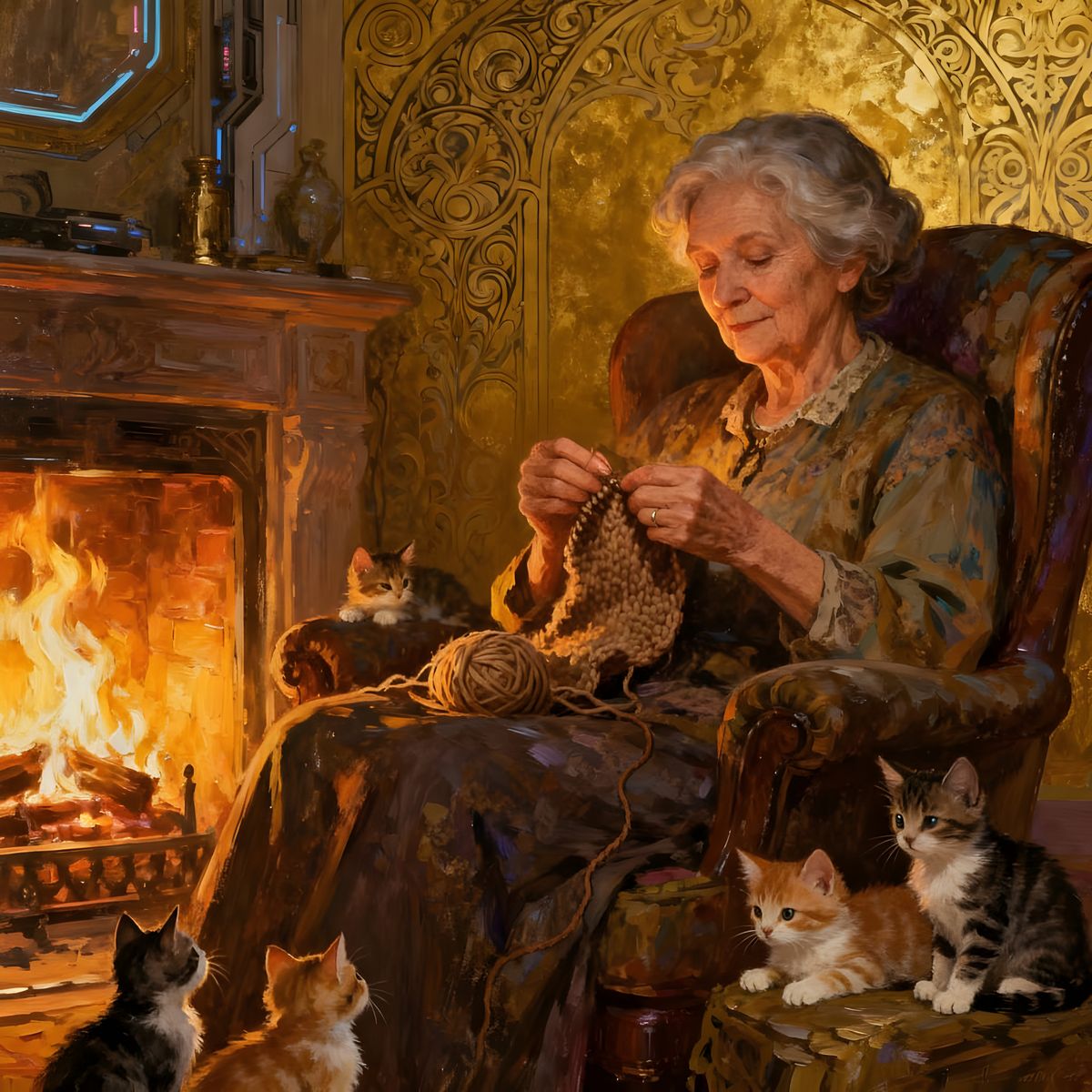 Oil painting of a grandmother sitting in a cozy living room armchair, knitting peacefully in front of a glowing fireplace with her kittens sitting beside her as if they are waiting for her to give something