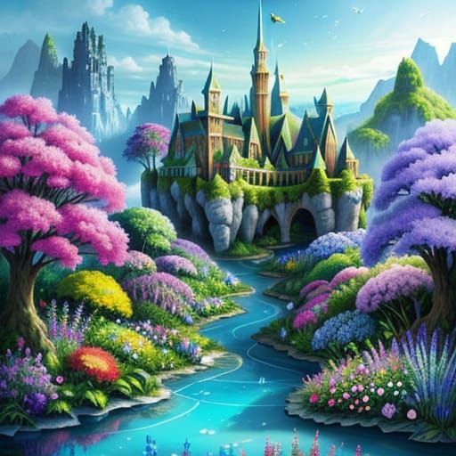 This image shows a vibrant and fantastical landscape, reminiscent of a utopian paradise. The scene is filled with colorful flora, creating a bright and inviting atmosphere.