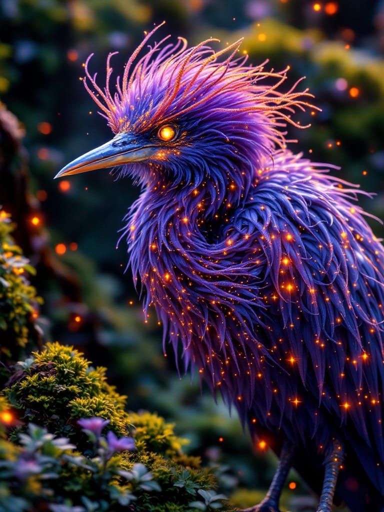 A vibrant image of a heron-like creature with iridescent plumage. The bird is set against a detailed mossy background, showcasing a maximalist and fantastical style with symmetrical and glowing elements.