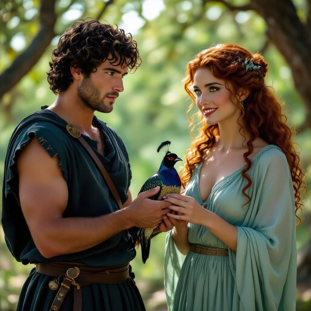 This image shows Odysseus's encounter with Calypso in a cypress forest. The cinematic shot, reminiscent of 35mm film, captures the dramatic morning light and their contrasting emotions.