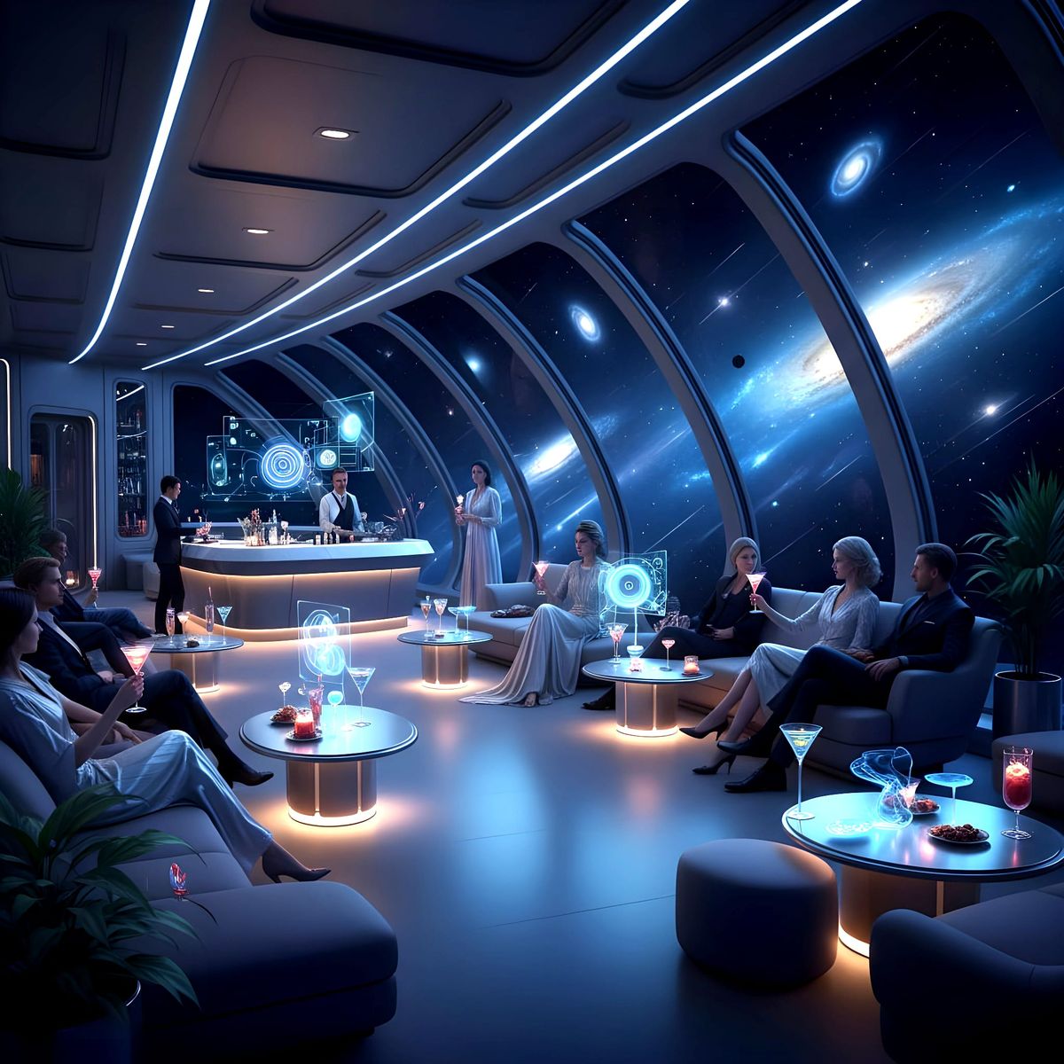 Chic individuals enjoy cocktails in a luxury starship lounge. Large windows reveal stunning views of passing stars and galaxies, enhanced by ambient mood lighting.