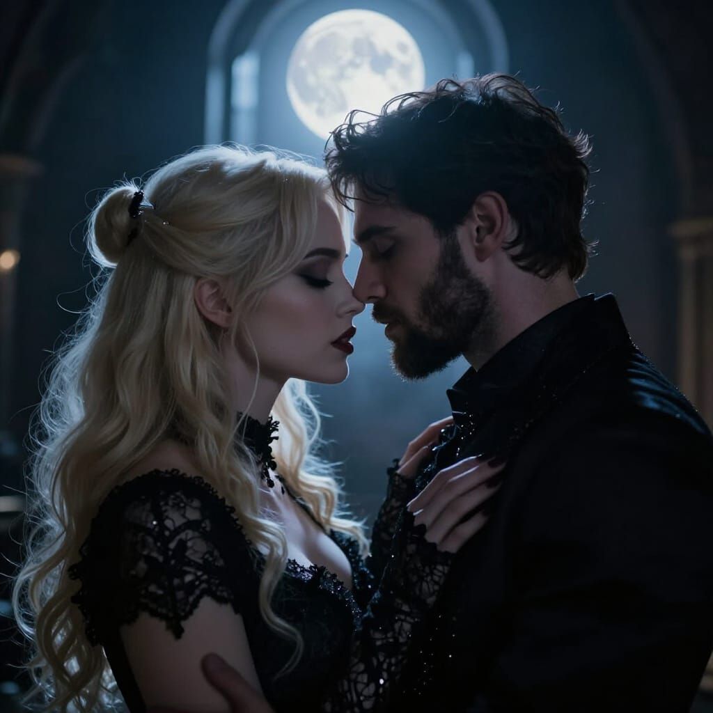 This image captures a hyper-realistic, cinematic close-up of a couple in a dimly lit room. Ethereal moonlight illuminates their intense, emotional connection, creating a moody and supernatural atmosphere.
