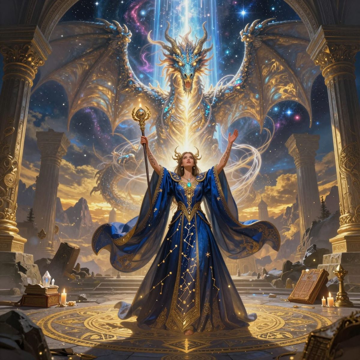 A magnificent celestial dragon emerges from a cosmic portal as a sorceress completes an intricate summoning ritual. Detailed robes and a dramatic scale create an epic fantasy scene.
