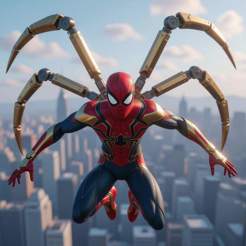 A dynamic image of Spider-Man in his Iron Spider suit soaring through the sky. The 3D anime art style features intricate details and a vibrant color palette, reminiscent of digital concept art.