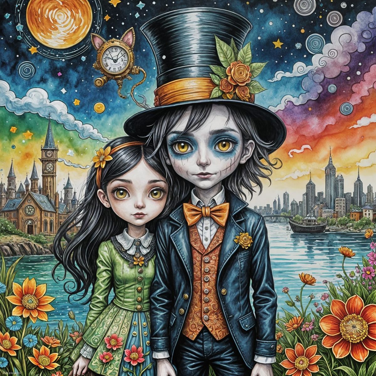This image depicts a whimsical sketchbook of a psychedelic, trippy, hippie, steampunk couple meeting after the zombie apocalypse in a derelict Sydney. The art features vibrant colors and intricate patterns.