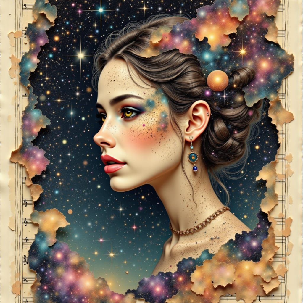 This image shows a beautiful woman's portrait composed of torn paper, galactic stardust, and musical scores. The artwork features glitchy effects and intricate surreal paper borders.