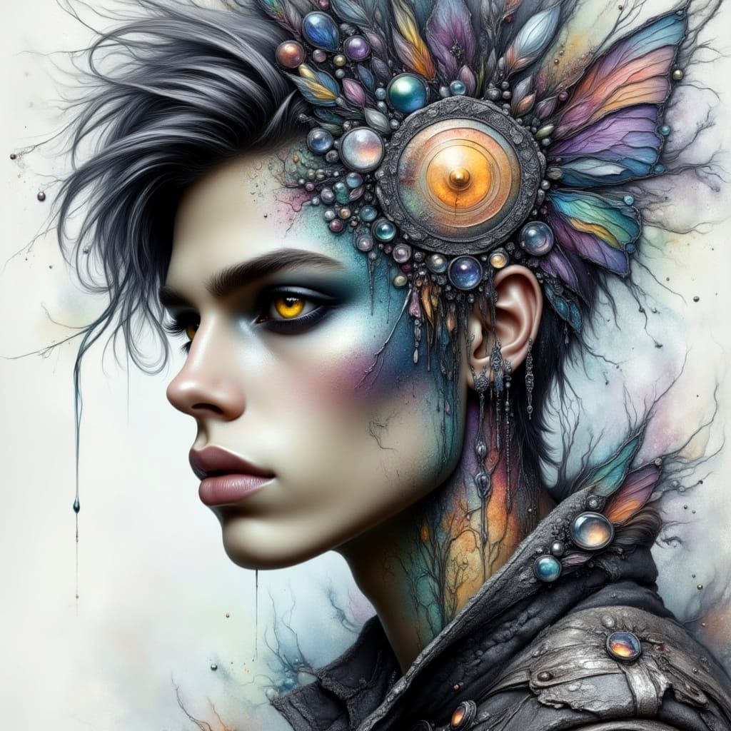 A melancholic portrait of a goth punk man with striking makeup and metallic silver droplets, rendered in a moody watercolor style with pastel and galaxy elements.