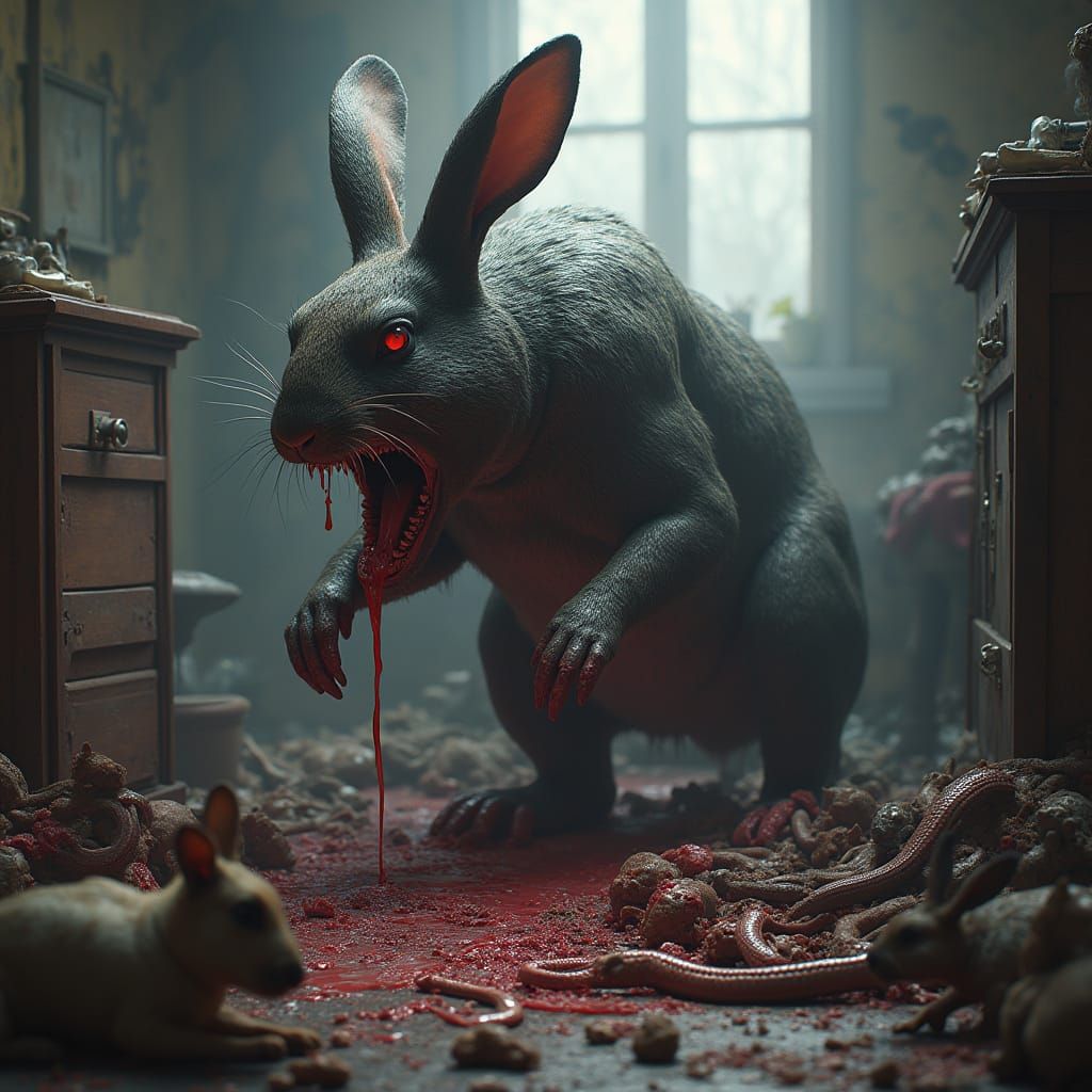 This image depicts a fantastical scene of a diseased giant rabbit feasting on zombie corpses in a cluttered urban apartment, surrounded by numerous animals and amidst a backdrop of vibrant colors and intricate detail, reflecting a detailed matte painting style