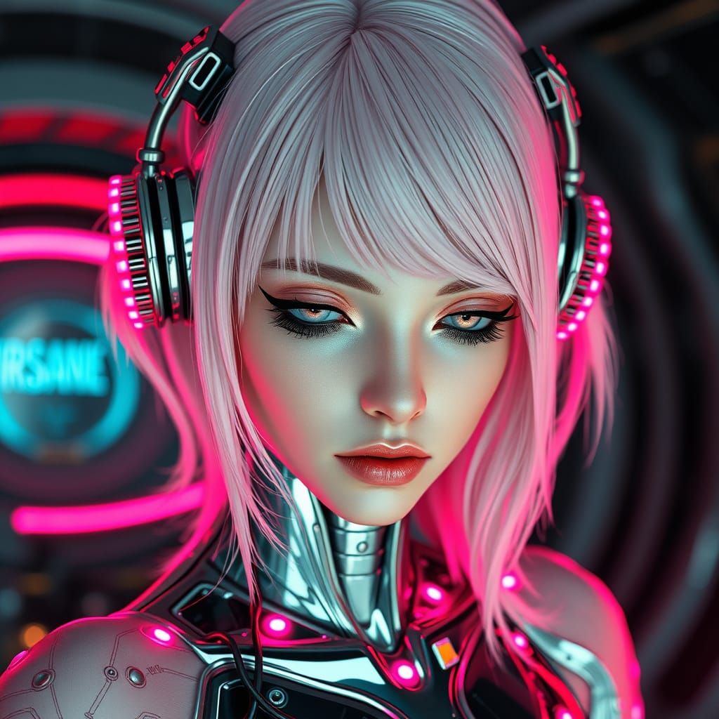 This image shows a futuristic portrait of a cybernetic girl with a chrome steel and organic body, set against a high-tech backdrop. Intricate wiring and glowing circuitry bring her to life, blending sci-fi style with realistic detail.