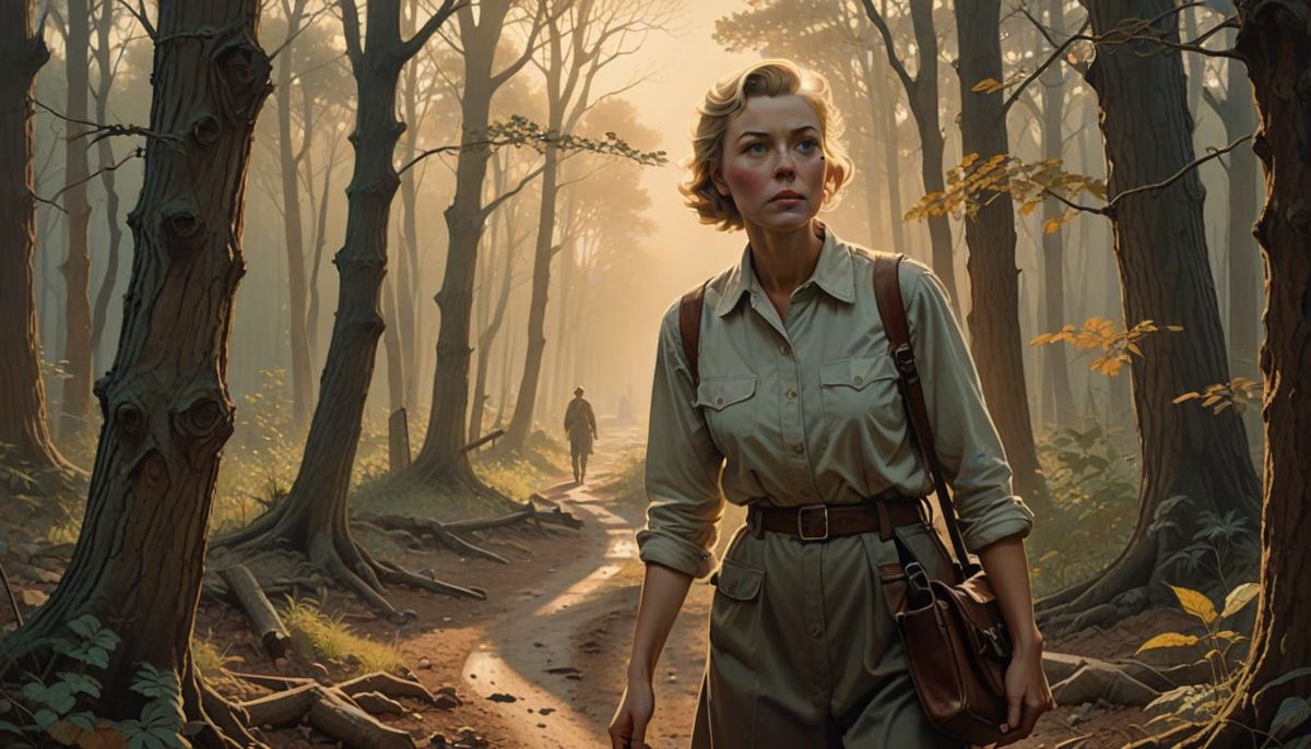 A nostalgic painting of a young girl detective, Trixie Belden, searching for evidence in a misty forest, surrounded by warm morning light and muted earth tones, capturing a classic illustration feel with intricate details and realistic facial expression.