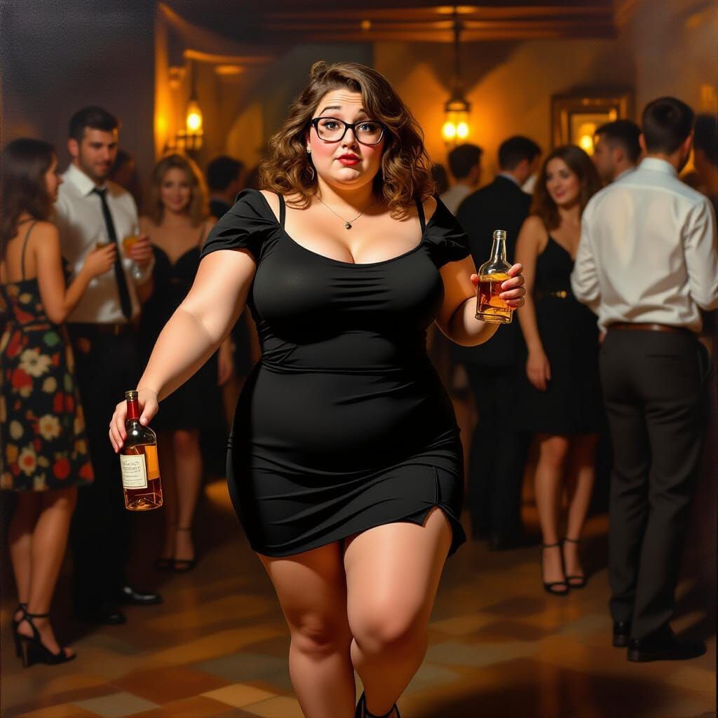 This image depicts a stumbling, drunk woman at a party, her flushed face and disheveled hair contrasting with her bright blue eyes. The scene evokes rich colors, intricate details and dramatic lighting.