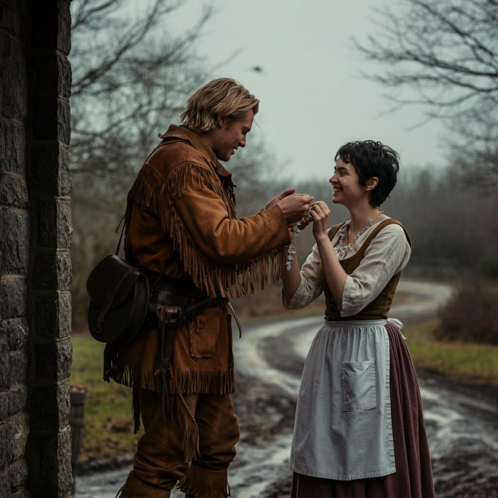 This image shows a young hunter presenting a beautiful woman with a unique crystal necklace in a misty, atmospheric scene, reminiscent of cinematic art styles and infused with subtle film grain and dramatic lighting.