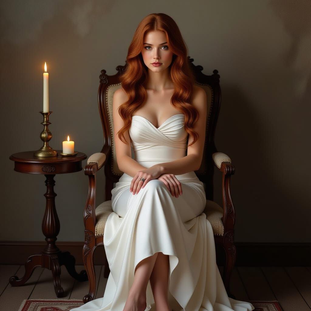 This photorealistic painting captures a melancholic woman with auburn hair in a white dress, seated by candlelight. The scene evokes a somber mood with classical and romantic influences.