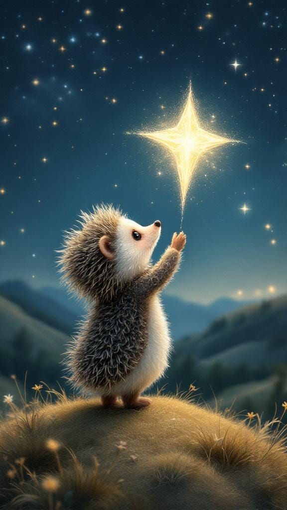 A charming image shows a felted hedgehog gazing at a starry sky from a hilltop. Soft lighting and a dreamy, whimsical style enhance the cozy, ethereal scene.