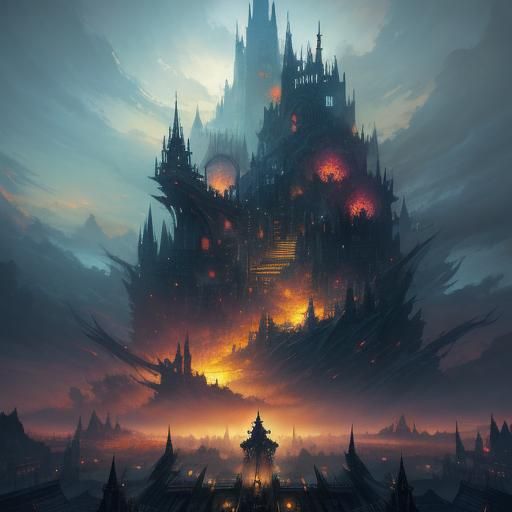 This image shows art in Yoshitaka Amano's distinctive style. The digital painting features deep colors, intricate details, and fantastical elements, reminiscent of fantasy concept art.