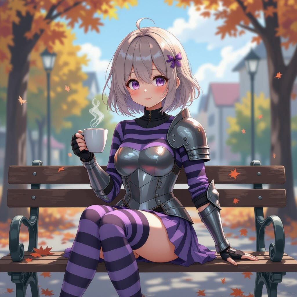 This image shows a cute anime girl in a striped shirt and armor, sitting with coffee on an autumn morning. Rendered in a vibrant graffiti art style with mixed media techniques.