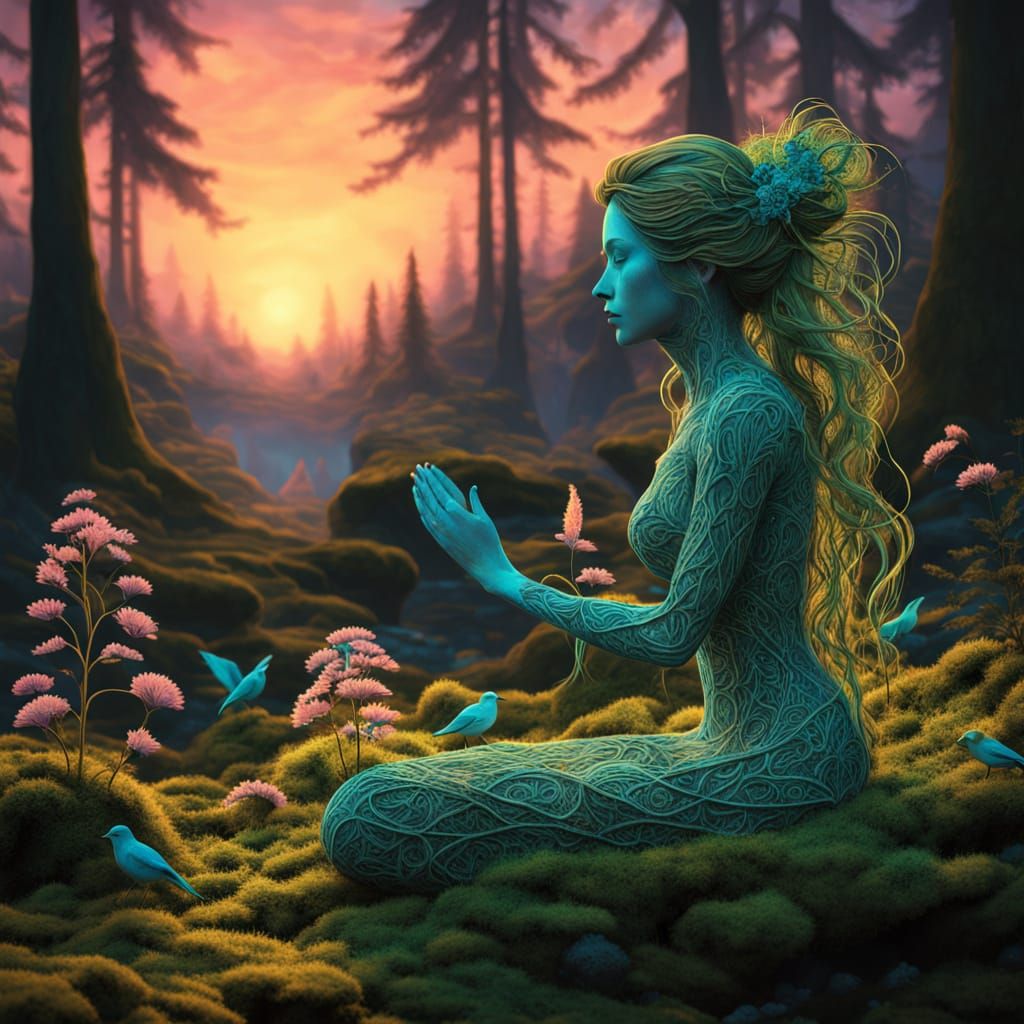 This image shows an eco-art sculpture blending the female form with nature using woven natural materials. The bio art collage incorporates glowing folklore creatures, birds, serene scenes, and abstract designs.