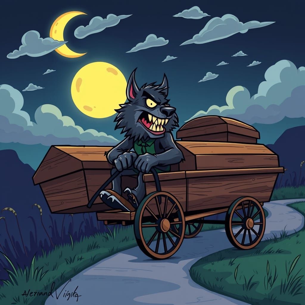 This vector cartoon shows a funny werewolf coachman with a cart of coffins on a night path. Features stylized clouds, a crescent moon, and vibrant colors with dynamic lighting.
