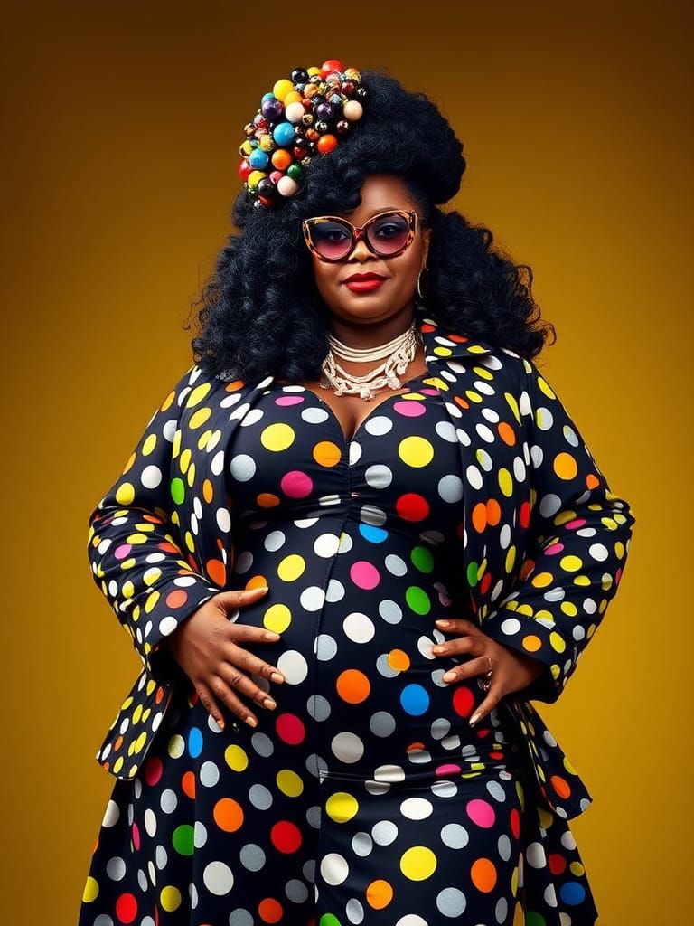 This image shows a plus-size model in vibrant, multicolored polka dot haute couture. The design evokes playful aesthetics with intricately designed polka dot patterns and statement pieces.