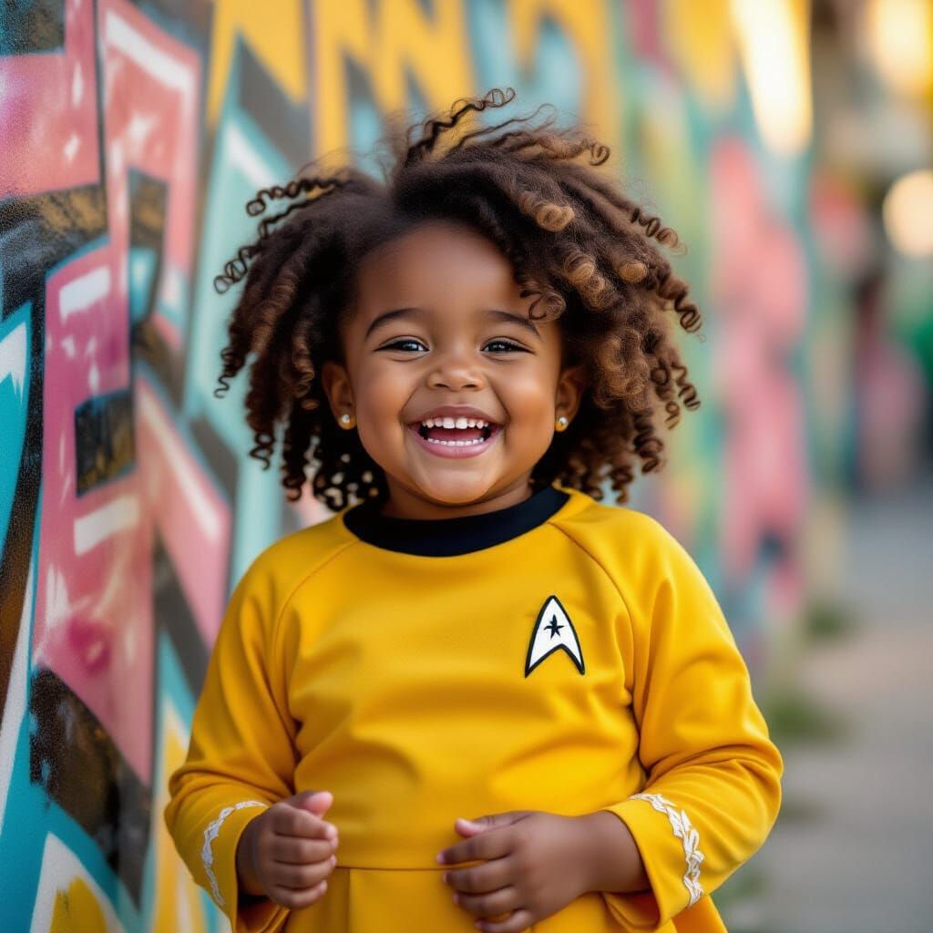 A beaming young Black girl dressed as Lt. Uhura. This vibrant street art style image captures the joy of Star Trek Day with colorful, high-contrast details.
