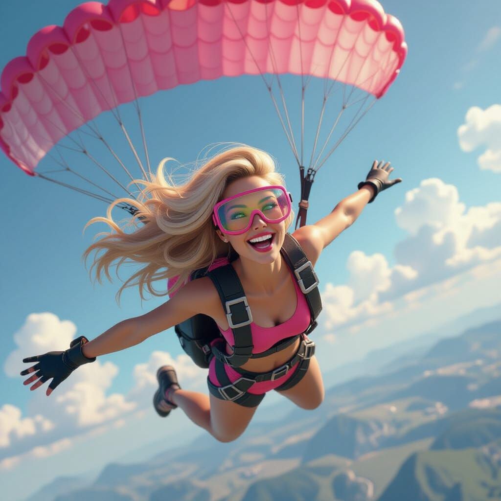 This image depicts a sassy woman with long blonde hair and bright safety glasses, joyfully leaping from a plane with a vibrant pink parachute. Rendered with dynamic lighting and a striking orange and teal color palette.