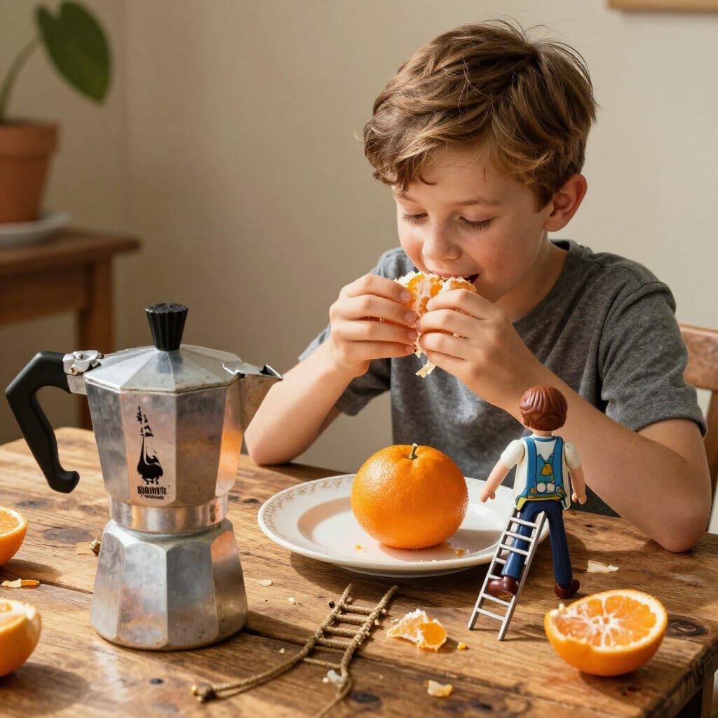 This image shows a teenager eating a tangerine, with a geyser coffee pot and a Playmobil figure on a rope ladder. Rendered in a charming, detailed illustration style with warm, earthy tones and dappled sunlight.