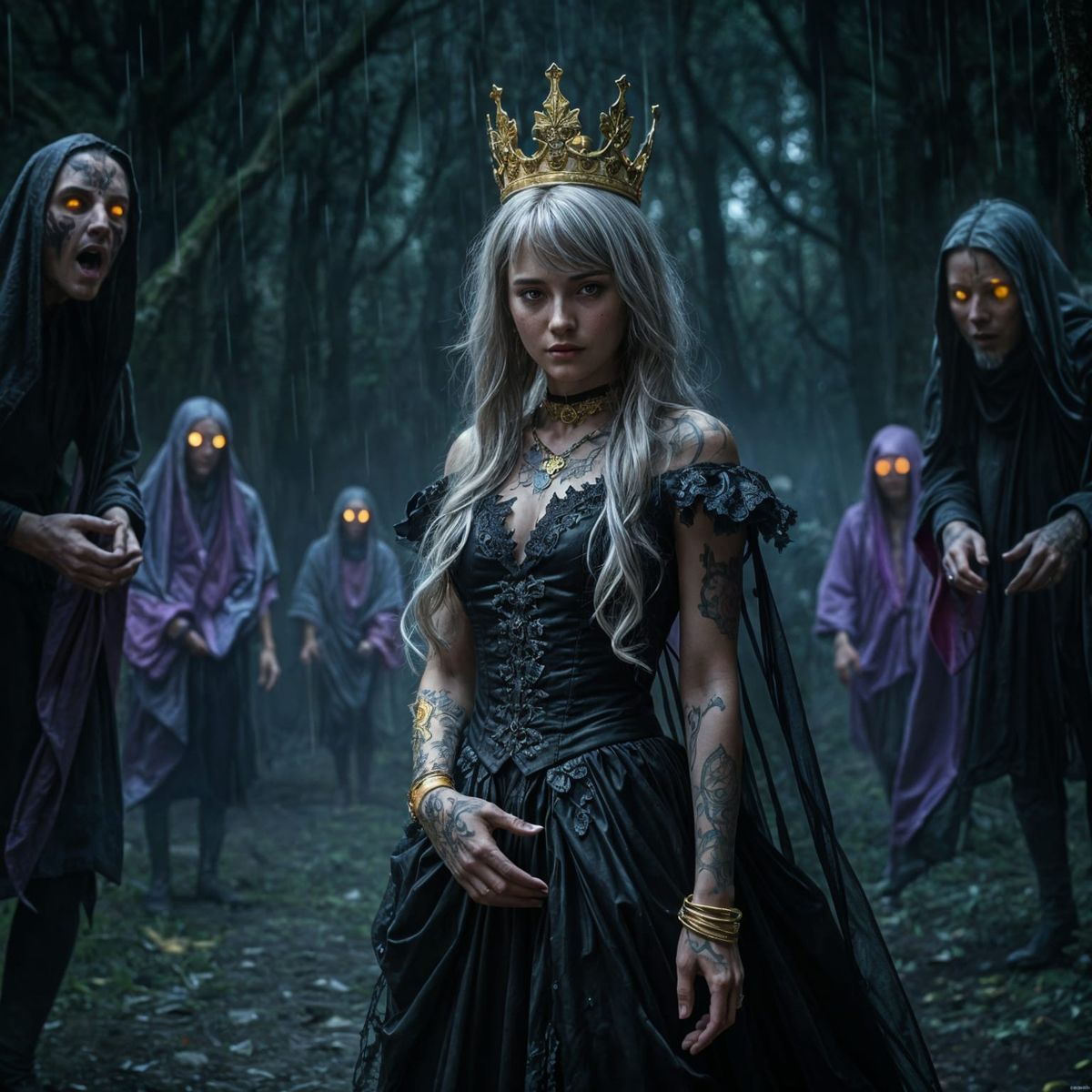 This image depicts a female figure in a dark, rainy forest surrounded by eerie fog and supernatural entities. With intricate details and dynamic lighting, the artwork showcases a blend of dark fantasy and realistic styles, featuring a striking black wedding gown and golden accessories.