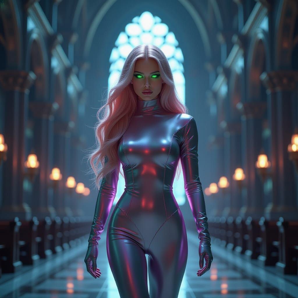 A striking picture of a statuesque woman with rose-gold hair and green eyes in a futuristic cathedral. She is wearing an iridescent catsuit in a hyperrealistic and vivid cinematic style.