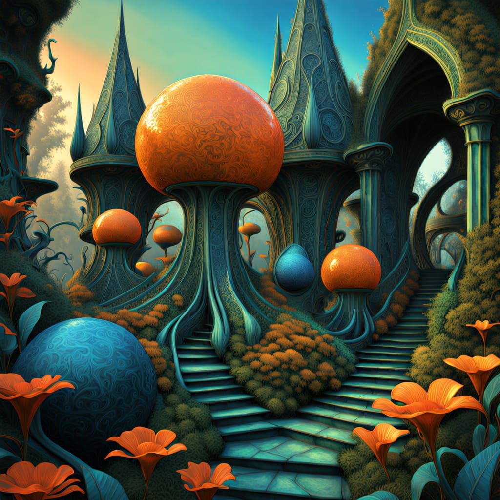This AI-generated image depicts a vibrant sunrise over a garden filled with wildflowers, featuring gothic archways and lanterns. The art style blends naive watercolor with a retro comic book aesthetic, rendered in hyperdetailed 8k resolution.