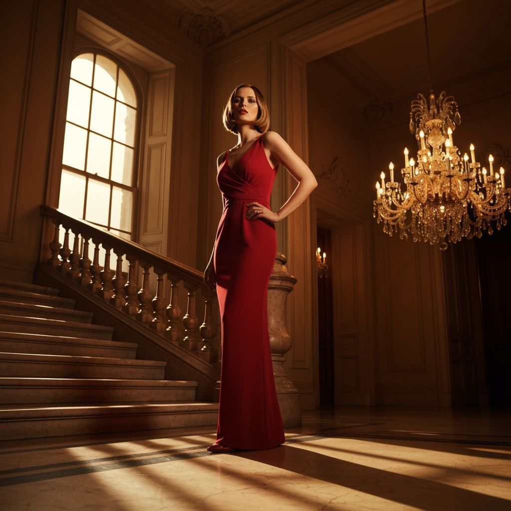 This image shows a woman in a pearl gown walking up a spiral staircase in a mansion. The image evokes a vintage, film noir aesthetic with dramatic lighting.