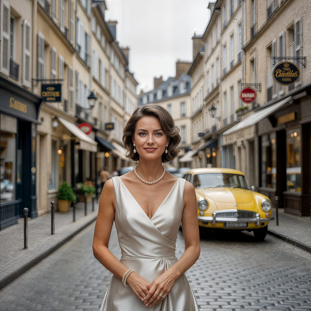 This image shows a stylish woman on a French street. She's wearing a silver dress and pearls, standing amongst weathered buildings and a classic CitroΓ«n, rendered with muted, nostalgic tones.