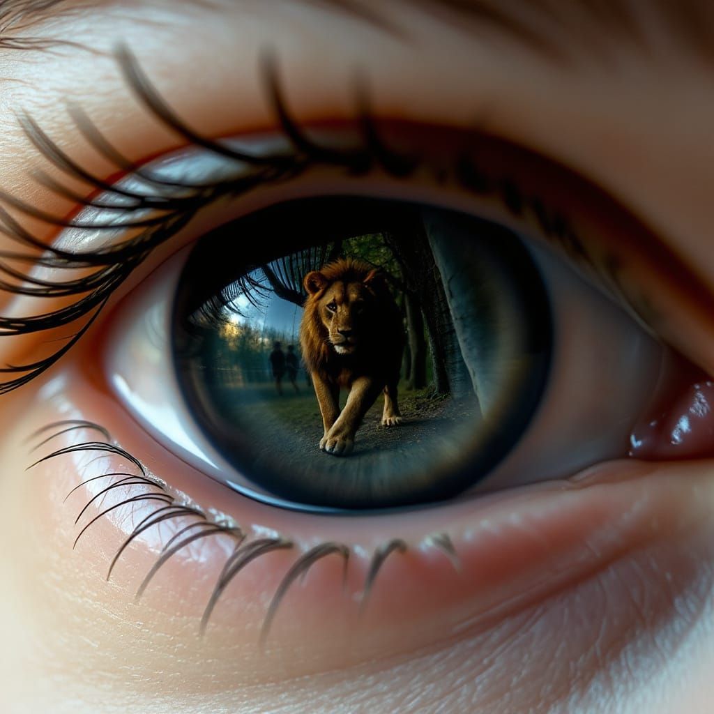 This image shows a hyperrealistic human eye in extreme detail. The iris contains a faint reflection of a lion walking through a dense jungle, captured with cinematic lighting and macro photography techniques.